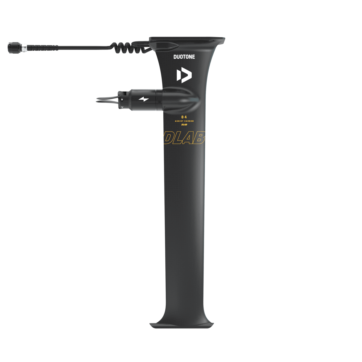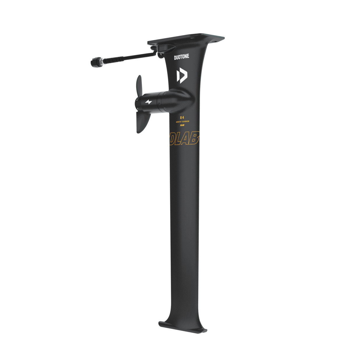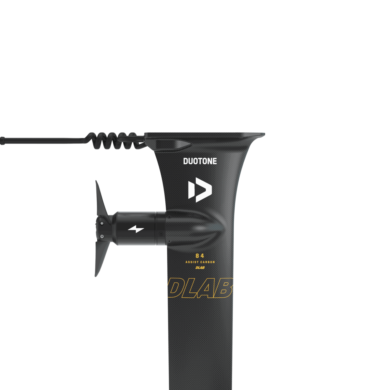 Built from lightweight carbon and measuring 84 cm, the eMast D/LAB is the lightest and most advanced model in the Foil Assist lineup. Designed for unparalleled performance and control, the D/LAB emast has a slim, low-drag profile that ensures playful and precise turning, exceptional rigidity, and maximum speeds.The motor pod is seamlessly molded into the mast profile, positioned 17 cm below the top plate, minimizing drag even during touchdowns. It features a two-blade folding propeller that reduces drag for effortless gliding on the wave. Thanks to the integrated gear system, the propeller unfolds instantly, providing a smooth transition as you kick out of the wave and power back out.The eMast mounts to your board and fuselage just like a conventional foil mast and is compatible with most brands' foilboards.For optimal battery performance, pair the eMast with a front wing of at least 900 cm² and a board with a minimum volume of 35 L.The eMast D/LAB features a 3BS connection and is compatible only with Duotone foils and Armstrong foils when used with our specially designed fuselage.The following items are included in the eMast Set D/LAB:Foil Assist Mast D/LAB including motor, bell, regular propeller blades, regular cable, and leashAssist eMast coverMotor bell & propeller coverScrew set and toolsCable fastener VSpare regular propeller bladesBattery bag